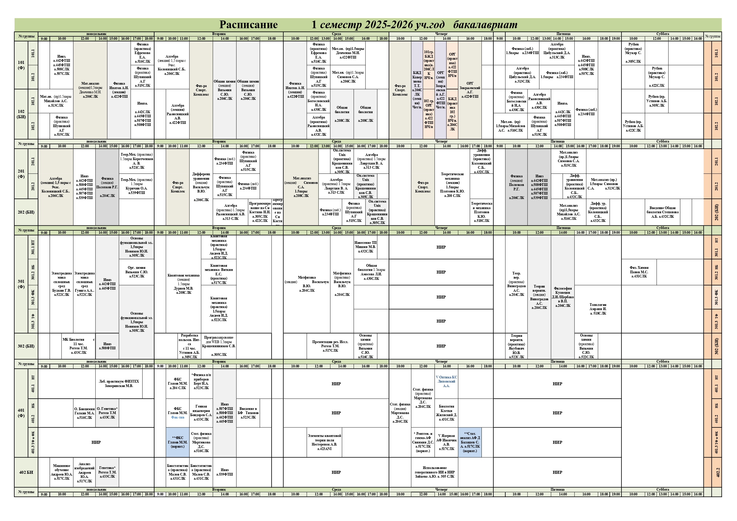 Расписание занятий студентов очной формы обучения на 1 семестр 2025-2026 учебного года (бакалавриат)